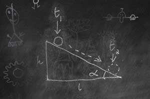 This all might seem a bit trivial and pointless, but stay with me for a bit. The notion I am circling around is the curious status of this concept of now. Let’s approach it another way: imagine yourself back at school, in a physics lesson. This may seem either an enticing or an entirely appalling prospect to you, but please indulge my little thought experiment. The teacher has chalked a diagram up on the blackboard (well, that was the cutting edge of presentation technology when I was at school). There’s the diagram up on the right. t1 and t2 obviously represent two instants of time for the ball, in its progress down the slope.
