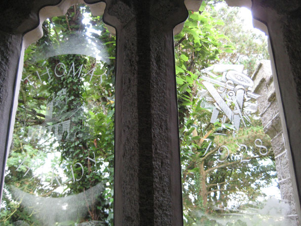 A few years ago a window was commissioned for the church, to commemorate Hardy’s association with it. Rather than being stained glass, the window is engraved, delicately and beautifully, by the late artist, Simon Whistler. I found it almost impossible to capture its quality in a photo; here is my best attempt, which just shows a part. You can see Hardy’s name in the centre pane, surrounding an image of the church  itself, and the date of his death on the right, under a representation of his architect’s tools. As you view the whole window, symbols and episodes from Hardy’s life shimmer against the backdrop of the graveyard outside, ghostly traces of the events of a century and a half ago.